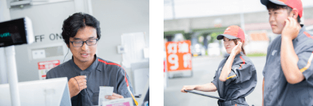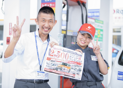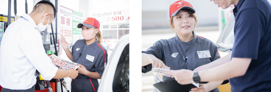 給油来店客に対し、積極的に車検の案内を行なうスタッフの皆さん。フレンドリーな対応が目をひく。
